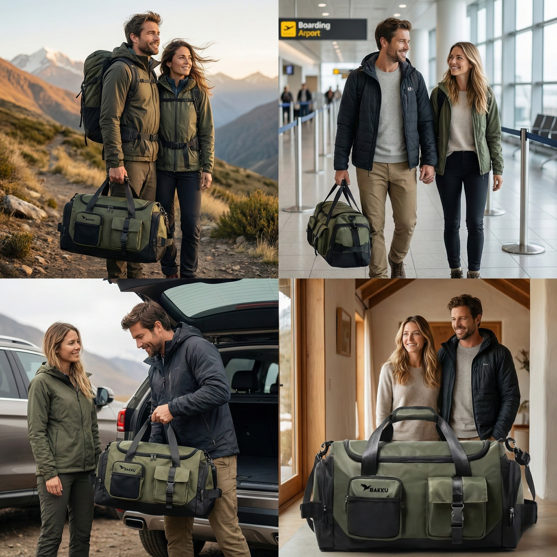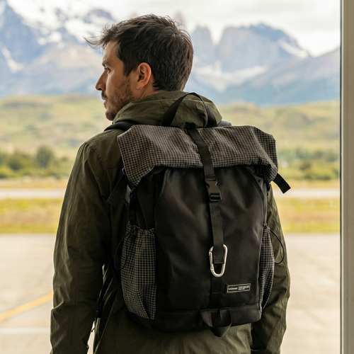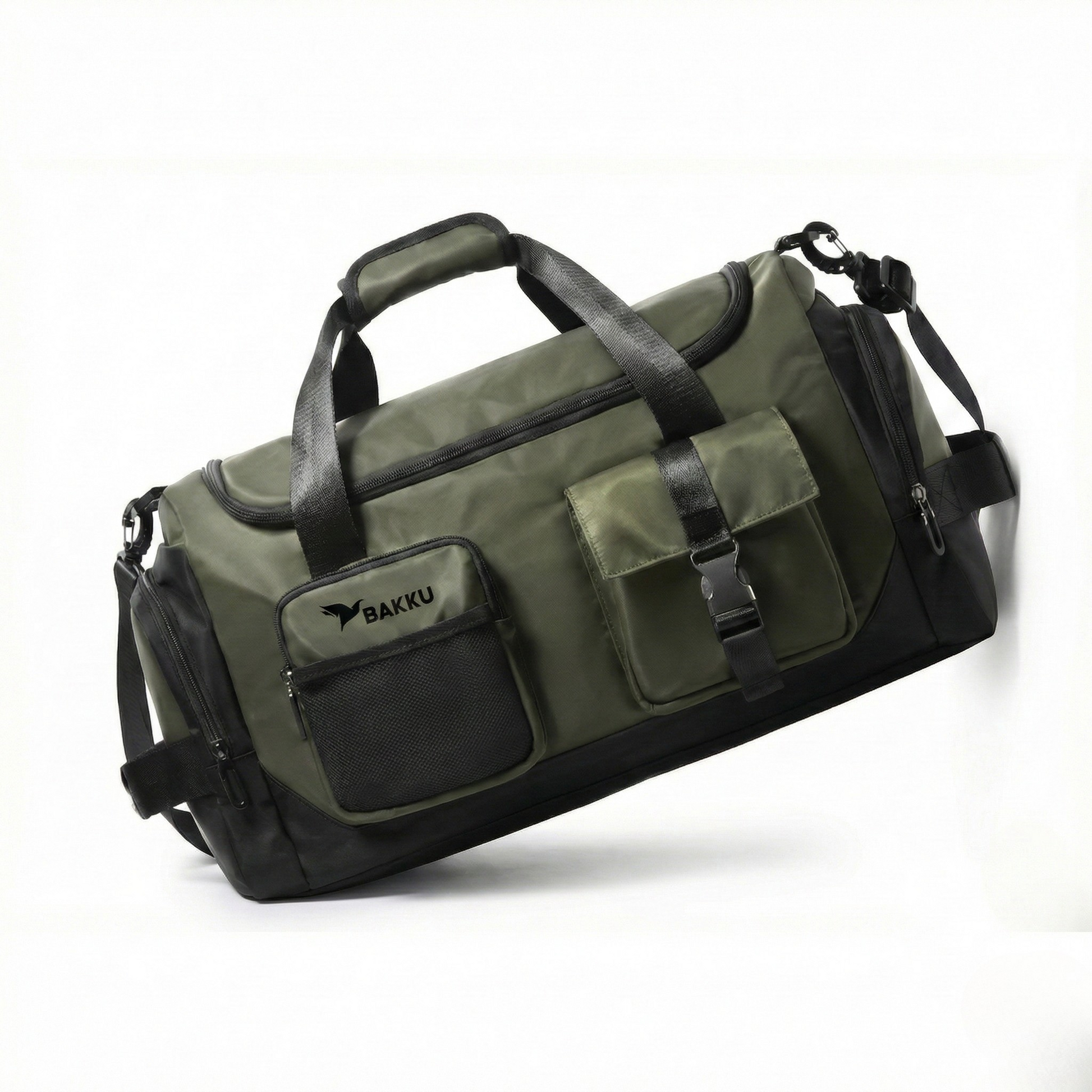 Bolso de viaje versátil con diseño tipo “duffel”, compartimentos laterales, correa cruzada y capacidad para fines de semana o gimnasio. Material resistente al agua.