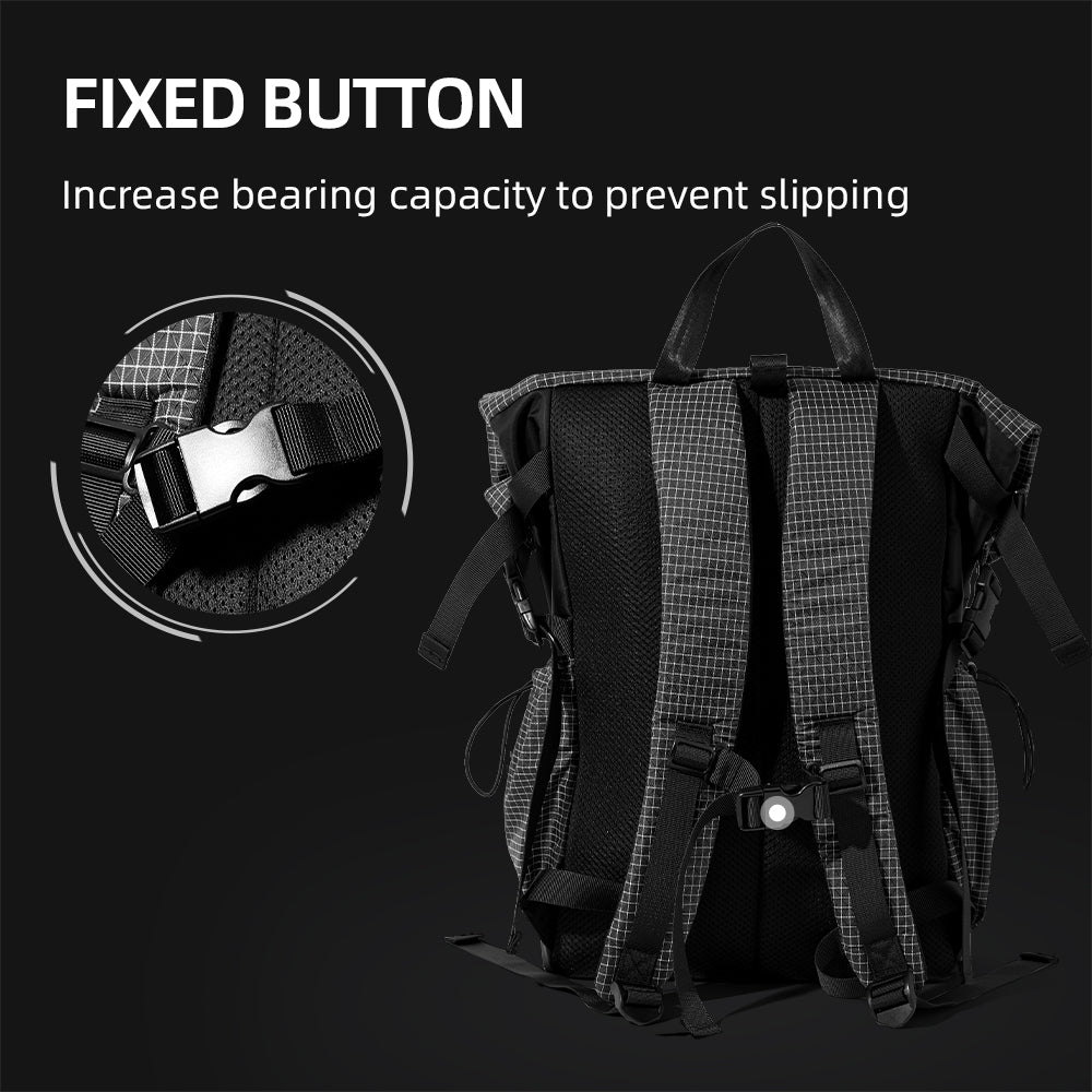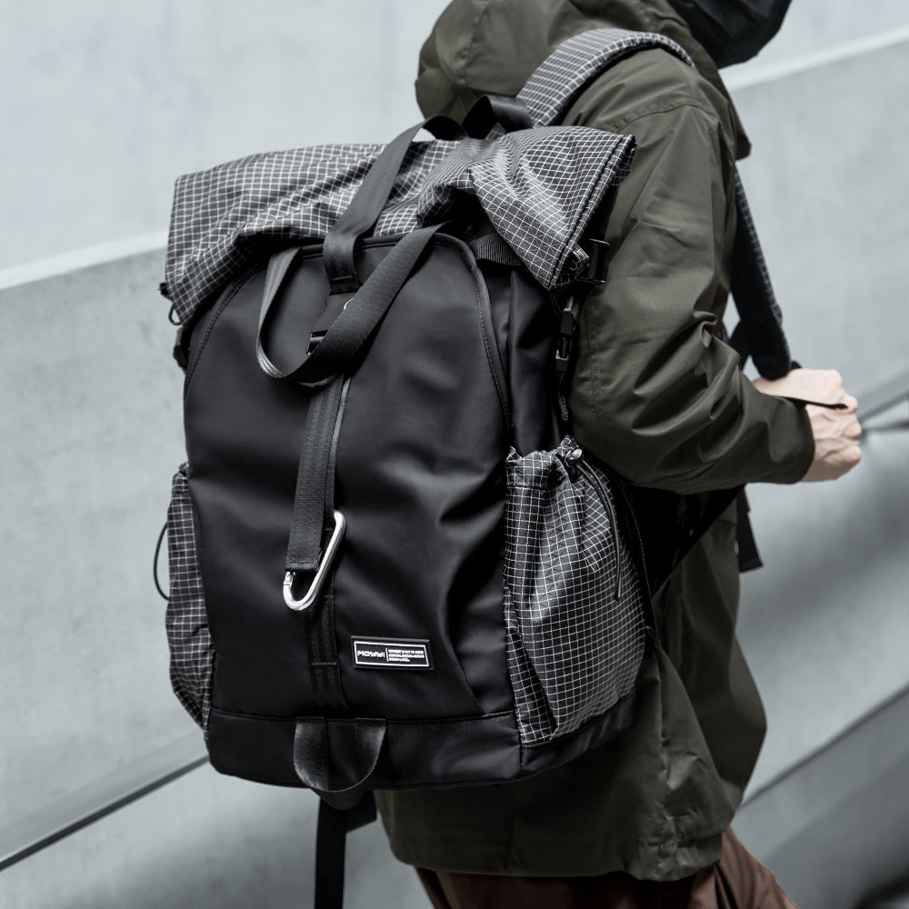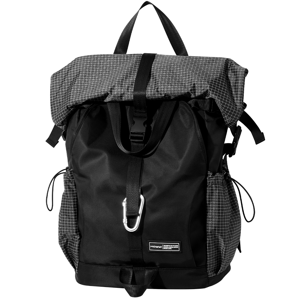 Mochila inspirada en la naturaleza. Diseño tipo “roll-top” o solapa superior con correas de sujeción y bolsillos laterales elásticos. Ideal para trekking urbano.